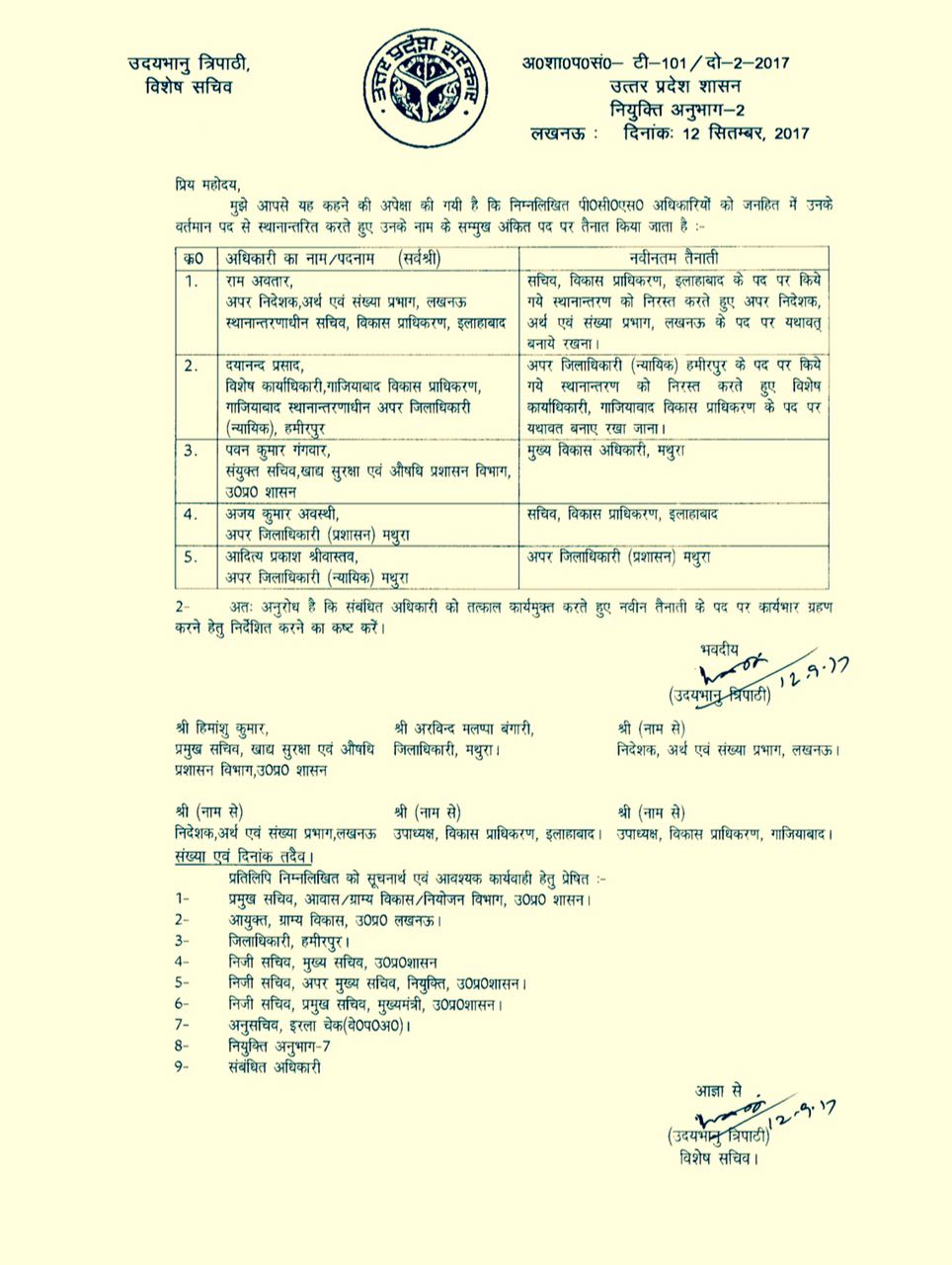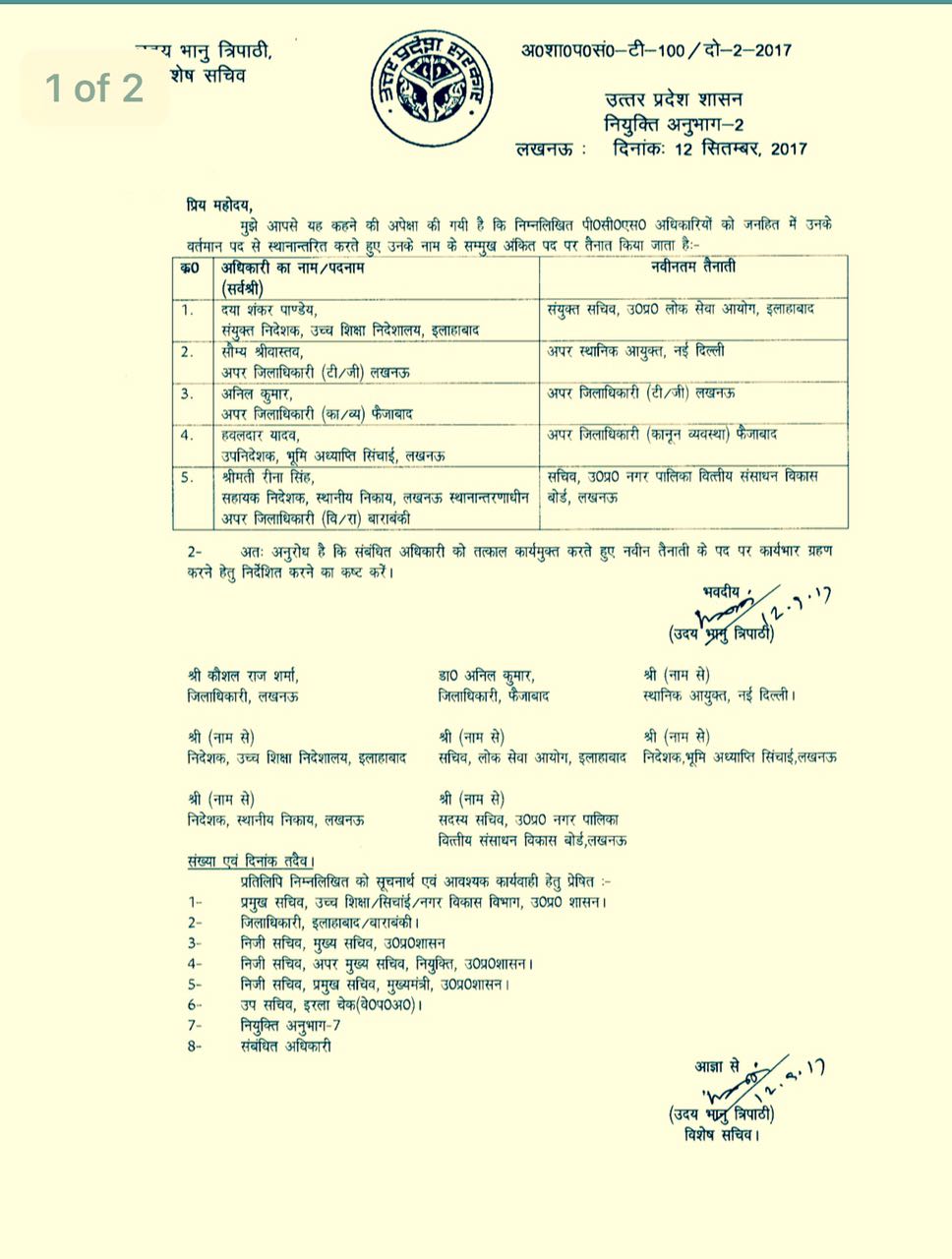 As many as 10 senior PCS officers transferred in Uttar Pradesh. The officers are: Daya Shankar Pandey; Saumya Srivastava; Anil Kumar; Hawaldar Yadav; Smt. Reena Singh; Ram Avtar; Dayanand Prasad; Pawan Kumar Gangwar; Ajay Kumar Awasthi; Aditya Prakash Srivatsava.
