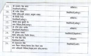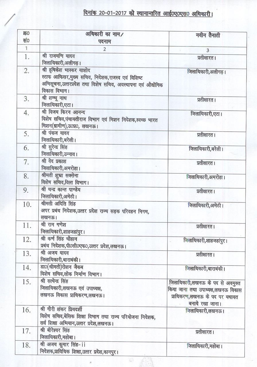 As many as 26 IAS officers have been transferred in Uttar Pradesh. The officers are: Rajmani Yadav; Hrishikesh Bhaskar Yashod; Shambhu Nath; Vijay Kiran Anand; Pankaj Yadav; Surendra Singh; Ved Prakash; Shubhra Saxena; Chandra Kant Pnadey; Aditui Singh; Ram Ganesh; Karn Singh Chauhan; Ajay Yadav; Dr. Roshan Jacob; Satyendra Singh; Gaguri Shankar Priyedarshi; Bireshwar Singh; Ajay Kumar Singh-II, Udayveer Singh Yadav; Rajiv Rautela; Vedpati Mishra; Smt. Selva Kumari J, Narendra Shankar Pandey; Suryapal Gangwar; Narendra Patel and Prabhu Narayan Singh.