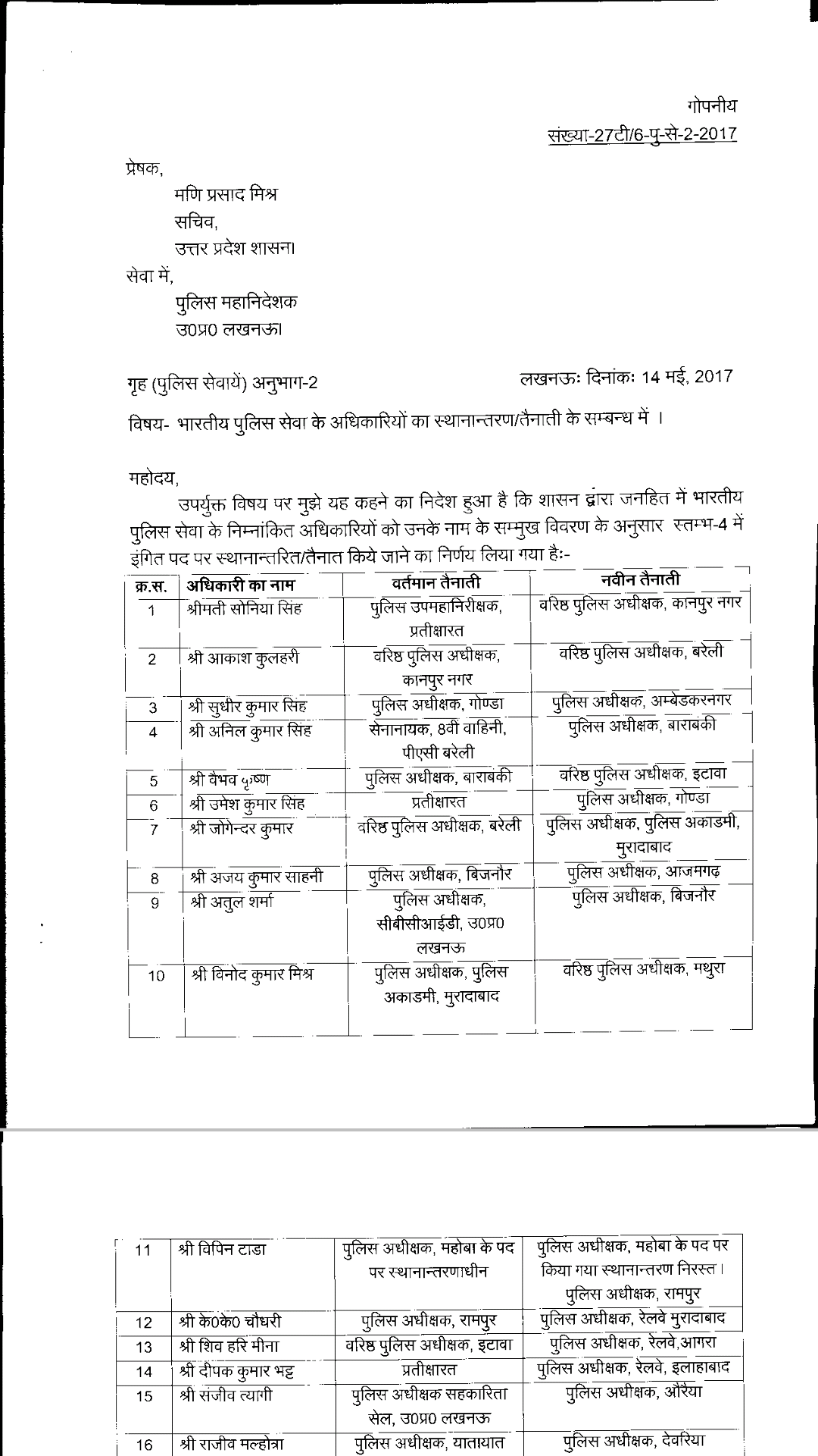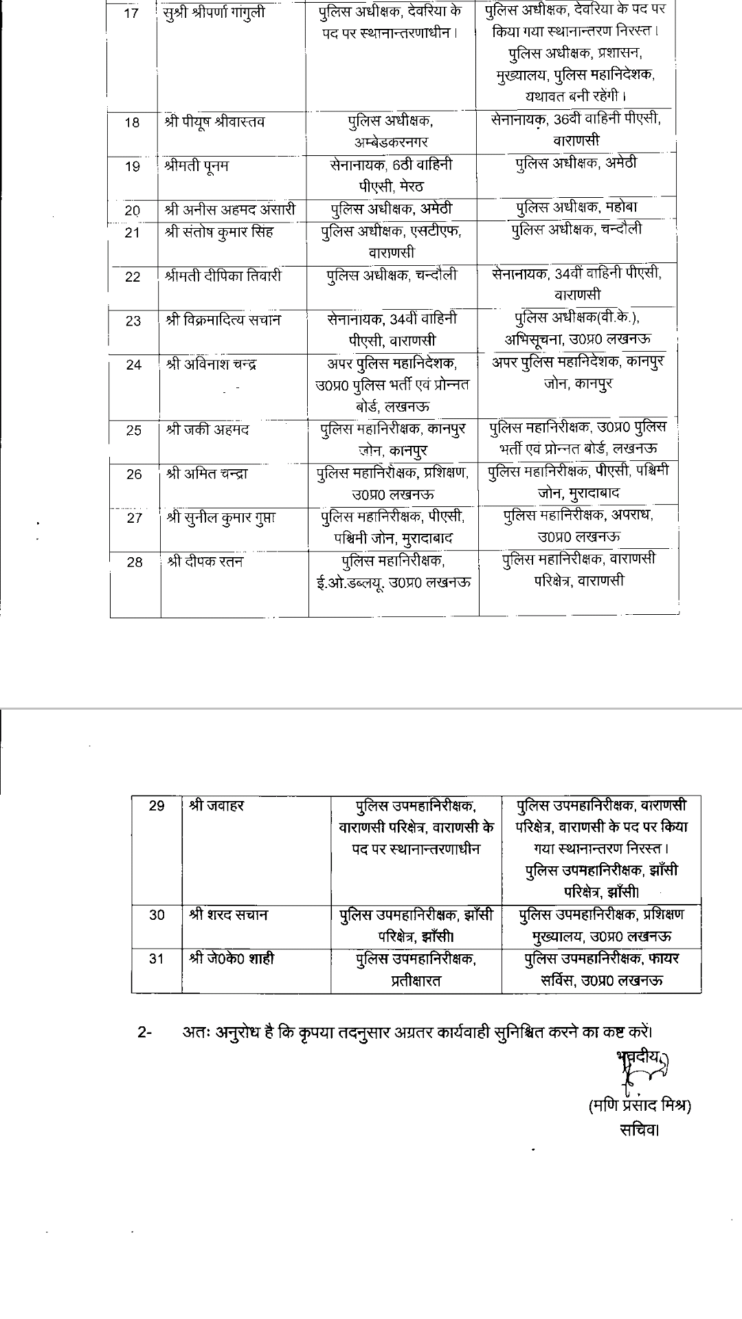 Bureaucracy 31 IPS officers transferred in Uttar Pradesh Last updated: May 15, 2017 4:41 am Parijat Tripathi Share SHARE As many as 31 officers belonging to Indian Police Service(IAS) have been transferred and posted locally in Uttar Pradesh. Please find the list of the officers below. Share This Article Email Copy Link Print Previous Article UP IAS Kunwar Fateh Bahadur joins BSP after retirement Next Article Opposition disrupts first session of UP assembly, throws paper balls at Governor Leave a Comment Leave a Reply Cancel replyYour email address will not be published. Required fields are marked *Comment * Name * Email * Website Save my name, email, and website in this browser for the next time I comment. Δ