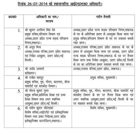 Six IAS officers have been transferred and posted in different places in Uttar Pradesh. the officers are: