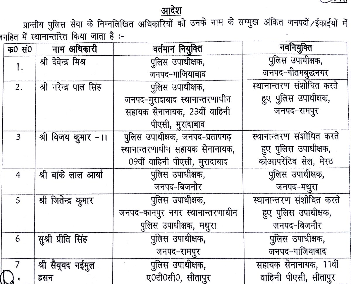 As many as 7 PPS officers have been transferred and posted locally by Uttar Pradesh Govt. Accordingly, Devendra Mishr; Narendra Pal Singh; Vijay Kumar-II; Banke Lal Arya; Jitendra Kumar; Ms. Preeti SIngh; Sayyed Naimul Hasan.