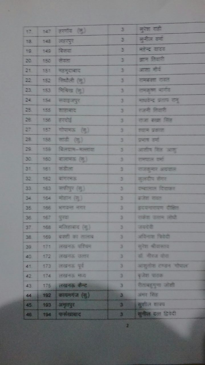BJP announced its second list of 155 candidates for Uttar Pradesh polls. They are, Harsh Bajpayee from Alahabad North; Nand Kumar from Alahabad South; Dr. Ajay Bharti from Bara; Rajmani Kaul from Kaurav; Mayankeshwar Singh from Tiloi; Suresh Pasi from Jagdishpur; Umashankar Pandey from Gauriganj; Garima Singh from Amethi; Omprakash Pandey Bajrangi from Esoli; Seetaram Verma from Jaisingh  Pur; Devmani Dubey from Lambhua; Rajesh Gautam from Kadipur; Vaijnath RAwat from Haidergarh; Baba Gorakhnath from Milkhi pur; Ved Prakash Gupta from Ayodhya; Avdesh Dwivedi from Katehari; Sanju Devi from Tanda; Anita Kamal from Alapur; Rakesh Singh from Jalapur; Chnadra Prakash Verma from Akbar Pur; Akshyewar Lal Gaur from Balha; Madhuri Verma from Nanpara; Arun Veer Singh from Matera; Sureshwar Singh from Mahasi; Anupama Jaiswal from Bahraich; Shubhash Tripathy from Piyagpur; Alekshendu Kant Singh from Bhinga; Ram Pheran Pandey from Shrawasti; Kailwash Nath Shukla from Tulsi Pur; Shailu Singh from Gaisadi; RamPratap Verma from Utraula; Paltu Ram from Balrampur; Vinay Dwivedi from Mehnol; Pratik Bhushan from Gaunda; Ajay Pratap Singh from Kamal Ganj; Prem Narayan Pandey from Tarabganj; Ramaprati Shastri from Manka  Pur; Prabhat Verma from Gaura; Satish Dwivedi From Etawa; Raghuvendra Pratap from Fumriyaganj; Ajay Singh from Hariya; Chandra Prakash Shukla from Kaptanganj; Sanjay Jaiswal from Rugoli; Dayaram Chaudhary from Basti Sadar; Ravi Sonkar from Mehdawal; Digvijaya Narayan from Khalilabad; Shriram Chauhan from Ghanghata; Sunil Verma from lahar pur; Mahendra Yadav from Bisda; Gyan Tiwari from Sewda; Ash Maurya from Mehmudabad; Ram Krishnan from Bhibik; Madhvendra Pratap from Sadaijpur; Rajni Tiwari from Shahabad; RajaSingh from Hardoi; Shyam Prakash from Mopamau; Prabhat Verma from Sandi; Ashish Singh from Bilgram Malawa; Rampal Verma from Balamau; Raj KUmar Aggrawal from Sandila; Kuldeep Semar from Bangarmau; Brajesh Rawat from Mohaan; Hridya Narayan Dixt from Bhagwat Nagar; Rakesh Uttam from Purba; Jaya Devi from Malihabad; Avinash Trivedi from Bakki Ka Talaaw; Suresh Srivastava from Lucknow West; Dr. Neeraj Bose from Lucknow North; Ashutosh Tandon from Lucknow East; Brajesh Pathak from Lucknow Middle; Reeta Bahuguna Joshi from Lucknow Cantt; Amar Singh from KawamGanj; Sushil Shakya from Amritpur; Sunil Dutt Dwivedi from Farukhabad.