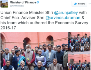 Politics Chief Economic Adviser & his team authored Economic Survey 2016-17 Last updated: January 30, 2017 3:03 pm Parijat Tripathi Share SHARE Union Finance Minister Shri @arunjaitley with Chief Eco. Adviser Shri @arvindsubraman & his team which authored the Economic Survey 2016-17. Share This Article Email Copy Link Print Previous Article Ex CAG Vinod Rai to head four-member BCCI administration panel Next Article CBSE Chairman R K Chaturvedi gets addl charge as Joint Secretary, 7th Central Pay Commission Leave a Comment Leave a Reply Cancel replyYour email address will not be published. Required fields are marked *Comment * Name * Email * Website Save my name, email, and website in this browser for the next time I comment. Δ