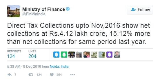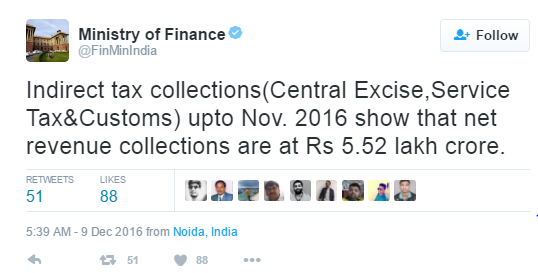 The Ministry of Finance has tweet the figures of Director and Indirect Tax collection upto Nov 2016. Direct Tax Collections show net collections at Rs.4.12 lakh crore, 15.12% more than net collections for same period last year and Indirect tax collections(Central Excise,Service Tax&Customs) upto Nov. 2016 show that net revenue collections are at Rs 5.52 lakh crore.