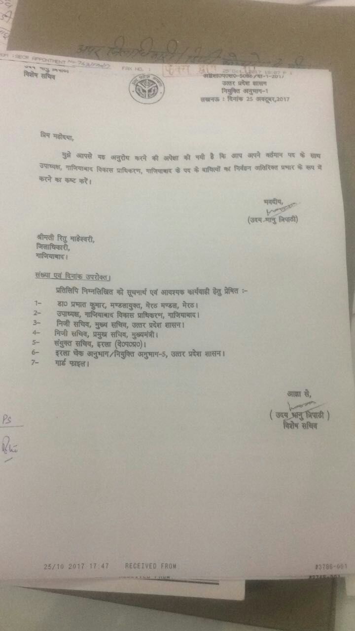 The 2003 batch IAS officer of Uttar Pradesh cadre, Ritu Maheshwari who is presently working as District Magistrate of Ghaziabad has been given additional charge of the post of Vice President of Ghaziabad Authority. Maheshwari who holds an electrical engineering degree from Chandigarh was executive director, Rural Electrification Corporation, under power ministry before she was transferred to Ghaziabad.