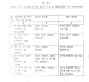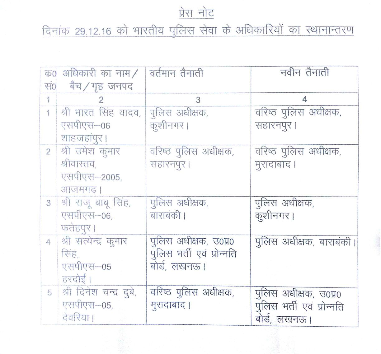 As many as 5 IAS officers transferred in Uttar Pradesh. They are: Bharat Singh Yadav; Umsh Kumar Srivastava; Raju Babu Singh; Satyendra Kumar Singh and Dinesh Chandra Dubey.