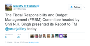 Politics FRBM Committee head N K Singh presents report Last updated: January 23, 2017 11:50 am Parijat Tripathi Share SHARE The Fiscal Responsibility and Budget Management (FRBM) Committee headed by Shri N.K. Singh presented its Report to FM @arunjaitley today. Share This Article Email Copy Link Print Previous Article Supreme Court asks CBI to probe its former director Ranjit Sinha Next Article Dr. S. Jaishankar gets extension for one year Leave a Comment Leave a Reply Cancel replyYour email address will not be published. Required fields are marked *Comment * Name * Email * Website Save my name, email, and website in this browser for the next time I comment. Δ