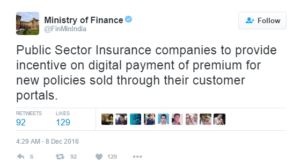 Others Incentives on digital payment for new policies Last updated: December 8, 2016 2:45 pm Parijat Tripathi Share SHARE Public Sector Insurance companies to provide incentive on digital payment of premium for new policies sold through their customer portals. Share This Article Email Copy Link Print Previous Article Railway Ministry announced free accidental insurance on digital payment mode Next Article Finance Ministry announced highlights on promotion of Digital and Cashless Economy Leave a Comment Leave a Reply Cancel replyYour email address will not be published. Required fields are marked *Comment * Name * Email * Website Save my name, email, and website in this browser for the next time I comment. Δ