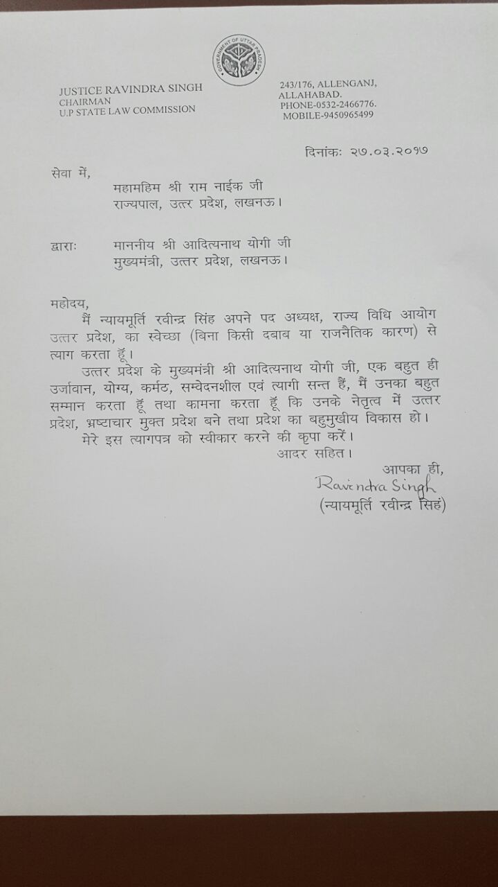 justice-ravindra-singhToday, Justice Ravindra Singh has resigned from the post of president of state law commission, Uttar Pradesh. He sent his resignation letter to UP governor Ram Naik.