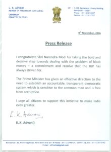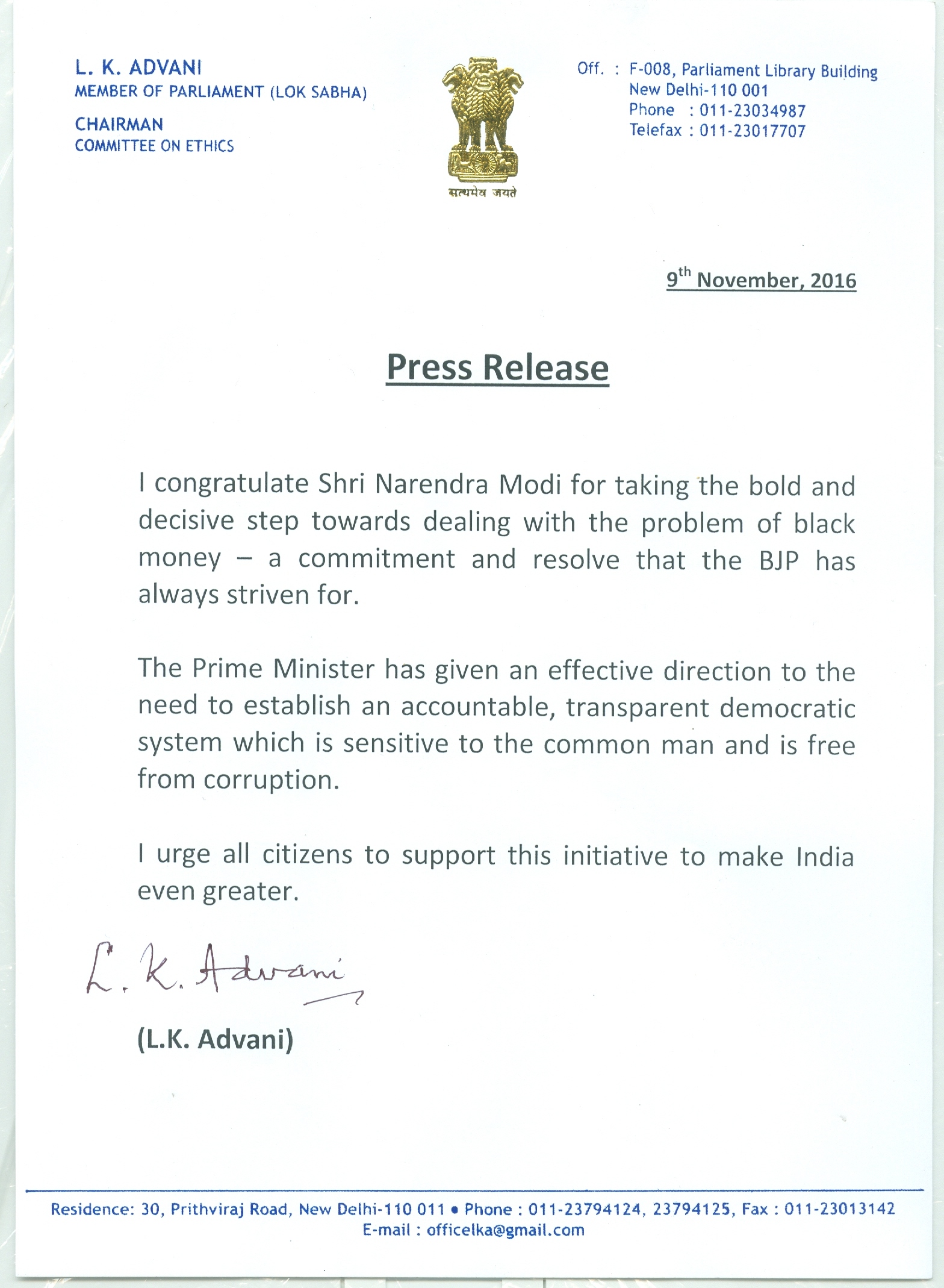 Politics L.K. Advani congratulates PM Modi Last updated: November 9, 2016 12:07 pm Parijat Tripathi Share SHARE Veteran BJP leader Mr. L.K. Advani has congratulated Prime Minister of India, Narendra Modi for such a bold step. Please find the attachment of the letter below. Share This Article Email Copy Link Print Previous Article President of India receives the first copy of book ‘CHARAIVETI, CHARAIVETI’ Next Article Delhi High Court gets five new judges Leave a Comment Leave a Reply Cancel replyYour email address will not be published. Required fields are marked *Comment * Name * Email * Website Save my name, email, and website in this browser for the next time I comment. Δ