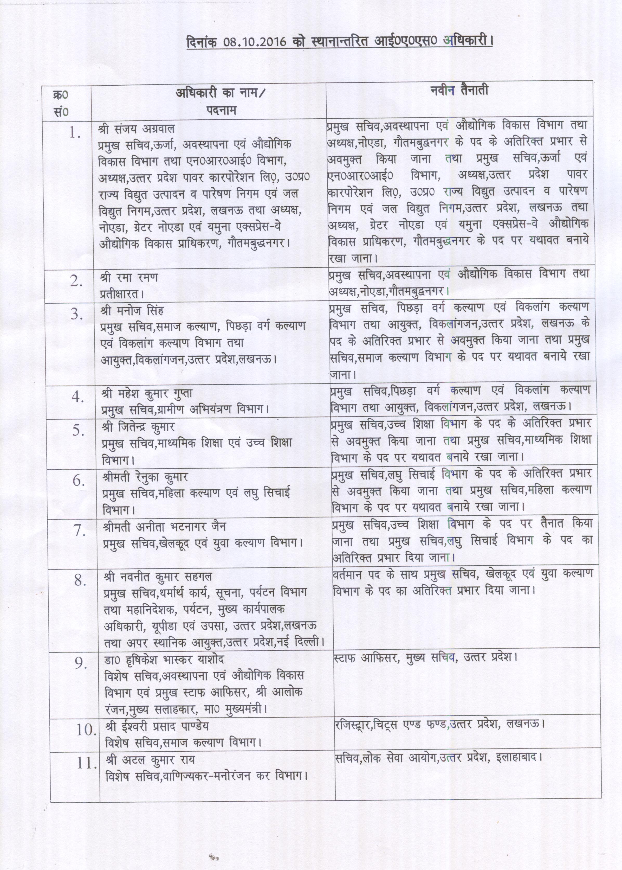 As many as 11 top level IAS officers has been transferred and posted locally by Uttar Pradesh Govt. Accordingly,