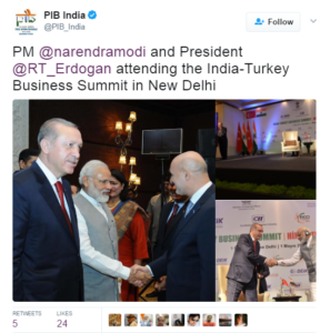 Today, Prime Minister Narendra Modi and President of Turkey R. T. Erdogan attending the India-Turkey Summit in New Delhi. He is on two days visit to India and this is his first visit to India as the Turkish President. Earlier in the day, Erdogan was awarded a ceremonial welcome by President Pranab Mukherjee at the Rashtrapati Bhavan. He also payed his tributes to Mahatma Gandhi at Rajghat.