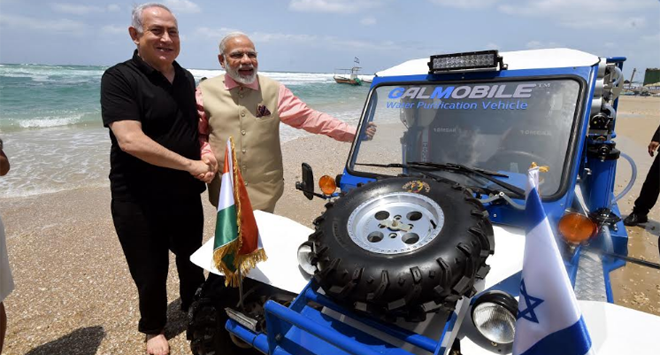 Onlast day of Israel tour, Prime Minister Modi and Israel PM Benzamin Netanyahu has attended a demonstration of Gal-Mobile water filteration plant at Olga beach, Israel. from here he will go to Germany to attend the G-20 Summit.