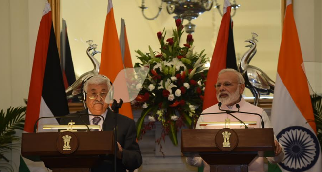 The Prime Minister of India Narendra Modi and the President of Palestine Mahmoud Abbas during the Joint Press statement at Hyderabad House in New Delhi. This Joint Press Conference held extensive talks on key bilateral, regional and international issues, including the Middle East peace process. In the morning, Abbas was warmly welcomed by President Pranab Mukherjee and Prime Minister Modi at Rashtrapati Bhawan. He was also given a ceremonial guard of honour there.