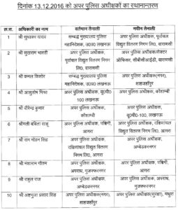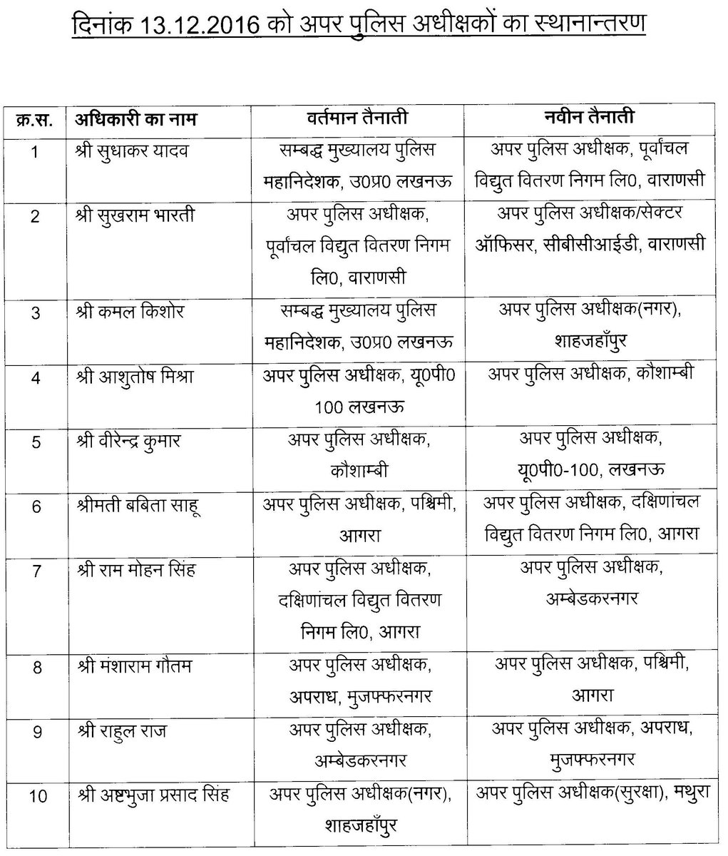 As many as 10 ASPs have been transferred in Uttar Pradesh on 13 December. Accordingly, Sudhakar Yadav; Sukhram Bharti; Kamal Kishor; Ashutosh Mishra; Virendra Kumar; Smt. Babita Sahu; Ram Mohan Singh; Mansharam Gautam; Rahul Raj and Ashtbhuja Prasad Singh.