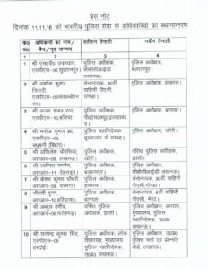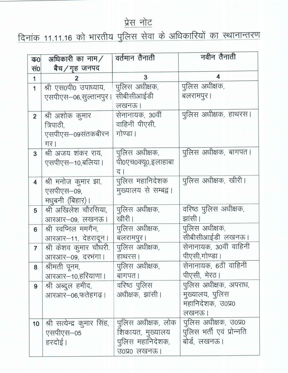 As many as 10 IPS officers have been transferred by the Uttar Pradesh Govt. Accordingly, S. P. Upadhyay; Ashok Kumar Tripathy; Ajay Shankar Rai; Manoj Kumar Jha; Akhilesh Chaurasiya; Swapnil Mamgain; Keshav Kumar Chaudhary; Smt. Poonam; Abdul Hameed; Satyendra Kumar.