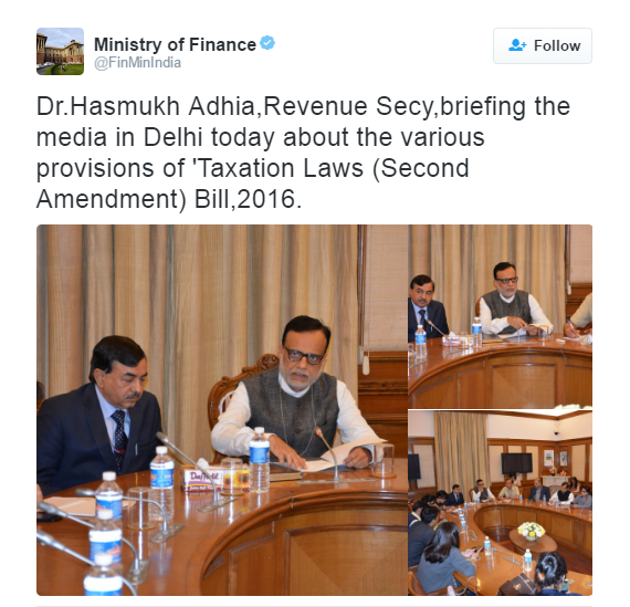 Today, Revenue Secretary, Dr. Hasmukh Adhia held a meeting on the provision of various ‘Taxation Laws (Second Amendment) Bill, 2016 in Delhi. CBDT Chairman, Shushil Chandra was also present in the meeting.