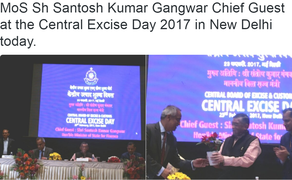 Politics Santosh Kumar Gangwar Chief Guest at the Central Excise Day 2017 Last updated: February 23, 2017 11:23 am Parijat Tripathi Share SHARE Minister of State, Sh. Santosh Kumar Gangwar Chief Guest at the Central Excise Day 2017 in New Delhi today. Share This Article Email Copy Link Print Previous Article Amar Singh’s expulsion to Rajya Sabha has been notified by Samajwadi Party Next Article Enforcement Directorate attaches Rs 1.02 crore of Kishore Bhajiawala Leave a Comment Leave a Reply Cancel replyYour email address will not be published. Required fields are marked *Comment * Name * Email * Website Save my name, email, and website in this browser for the next time I comment. Δ