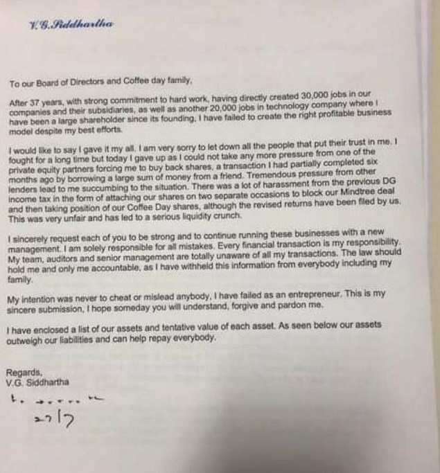 CCD founder, V G Siddhartha wrote a letter to his staff mentioning his financial struggle and failed business model and also about the harassment faced from the former Income Tax official. He wrote in his letter that he fought for a long time but today I gave up as I could not take any more pressure.